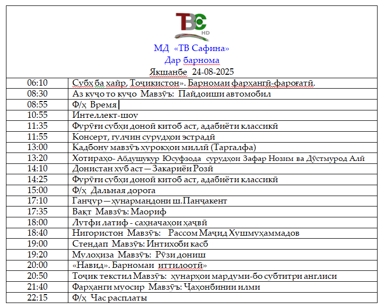 Хабарҳо August 23, 2025 ТАРТИБИ ПАХШИ БАРНОМАҲОИ ТЕЛЕВИЗИОНИ “САФИНА” БАРОИ ПАГОҲ, 24.08.2025. Муаллиф: «ТВС» 🖥 ТАРТИБИ ПАХШИ БАРНОМАҲОИ ТЕЛЕВИЗИОНИ “САФИНА” БАРОИ ПАГОҲ, 24.08.2025. 🖥 РАСПИСАНИЕ ТЕЛЕПЕРЕДАЧ ТЕЛЕКАНАЛА «САФИНА» НА ЗАВТРА, 24.08.2025. 🖥 BROADCAST SCHEDULE OF “SAFINA” TV CHANNEL FOR TOMORROW, 24.08.2025. https://t.me/tv_safina_official 352 10