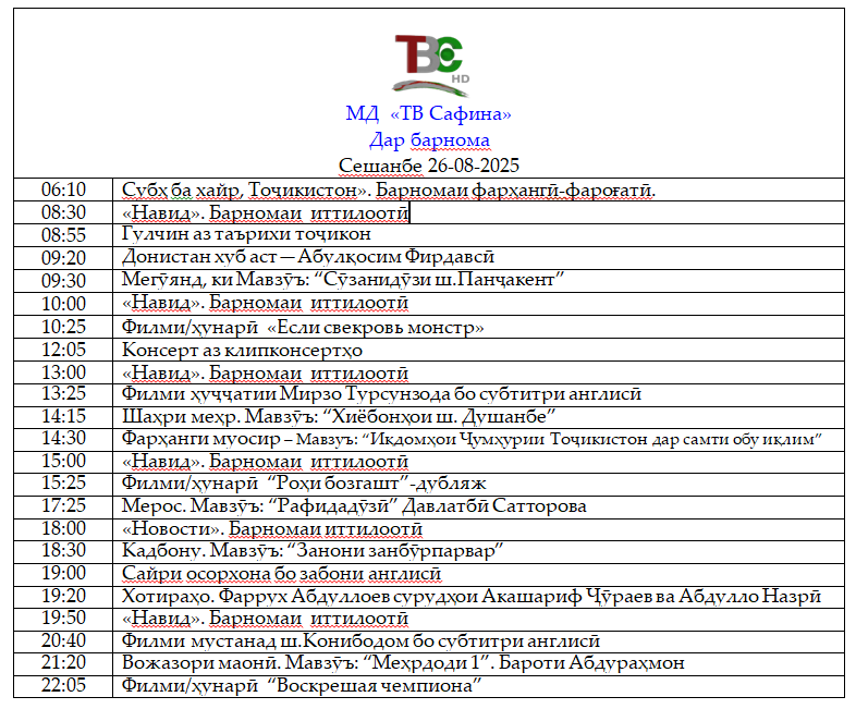 🖥 ТАРТИБИ ПАХШИ БАРНОМАҲОИ ТЕЛЕВИЗИОНИ “САФИНА” БАРОИ ПАГОҲ, 26.08.2025.